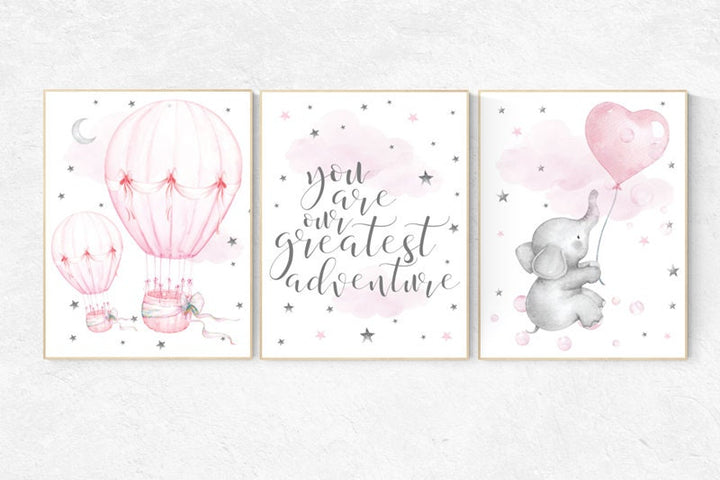 Nursery decor girl elephant, hot air balloon, pink and grey, cloud and stars, you are our greatest adventure, nursery wall art pink and gray