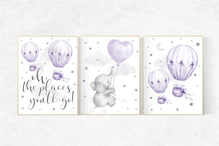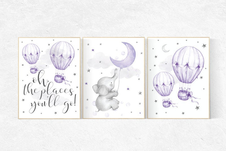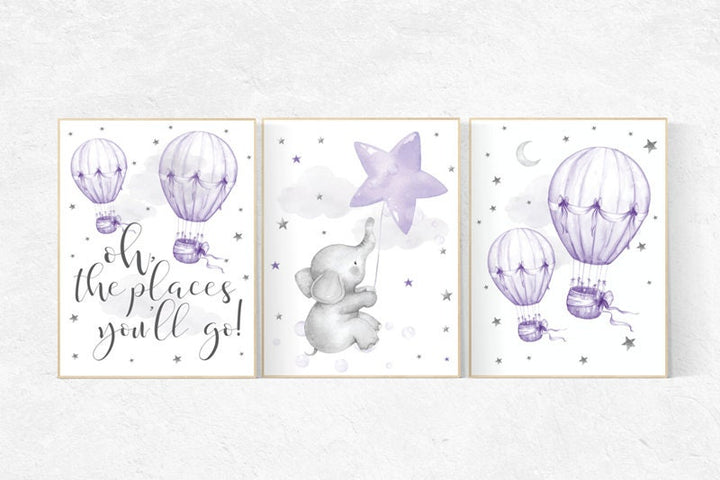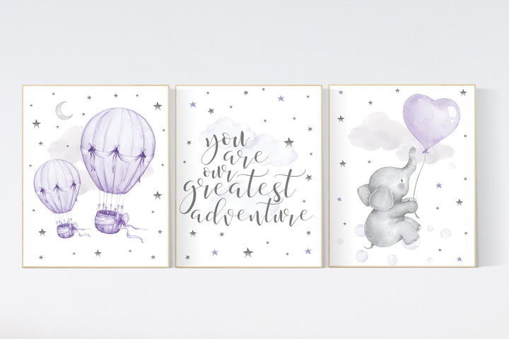 Nursery decor girl elephant, nursery decor girl purple, hot air balloon, lavender nursery, lilac nursery wall art. cloud and stars nursery