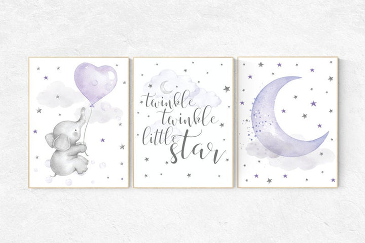Nursery decor girl elephant, Nursery decor girl purple, nursery wall art, lavender and gray, lilac nursery, twinkle twinkle little star