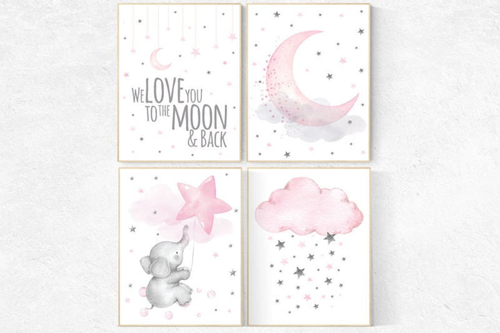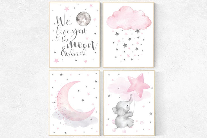 Nursery decor girl elephant, nursery prints, Nursery wall art girl, we love you to the moon and back, pink nursery wall art, cloud and star