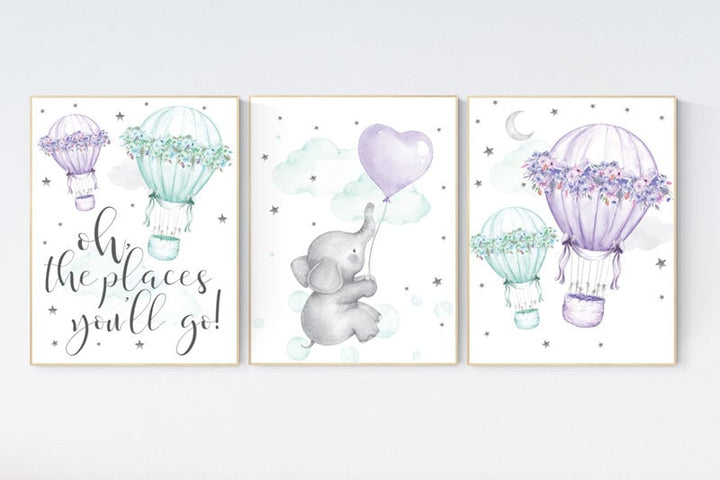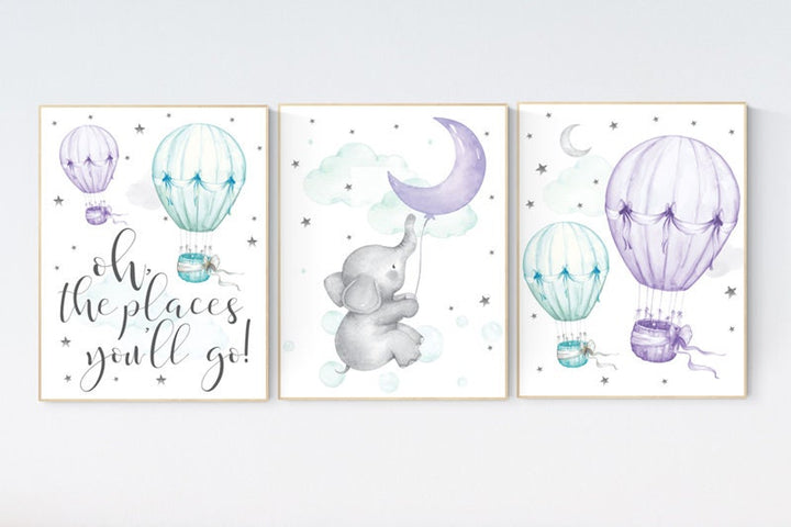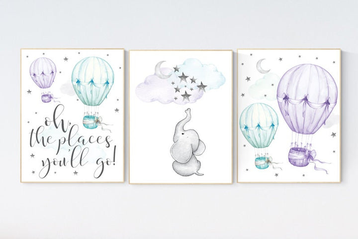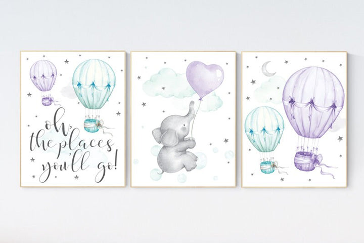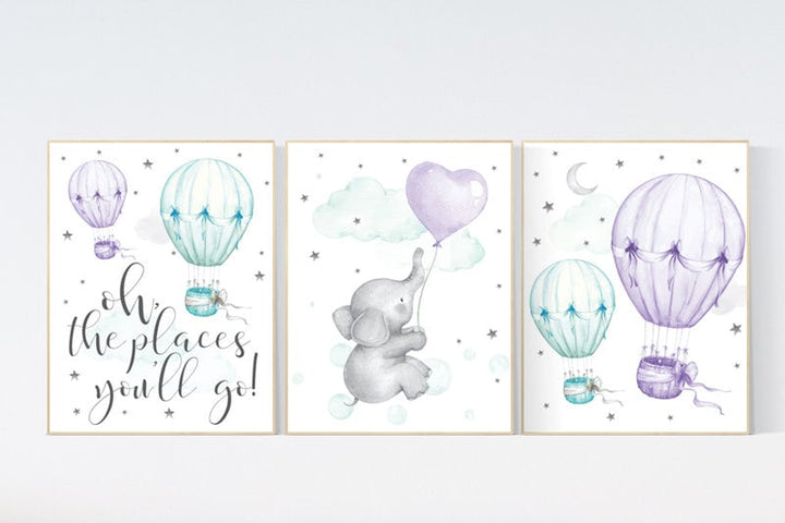 Nursery decor girl elephant, nursery decor girl purple, hot air balloon, purple mint, lavender, nursery decor girl lila, lilac mint, aqua