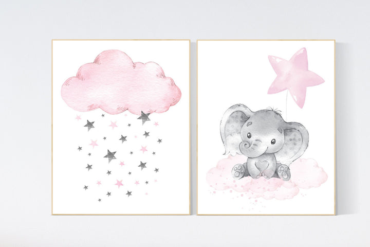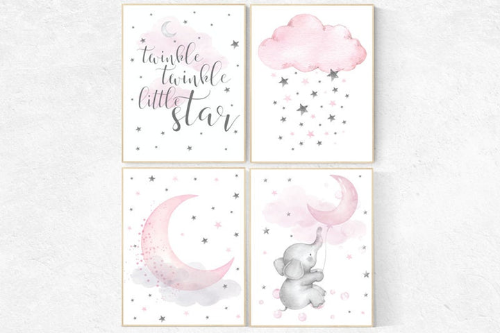 Nursery decor girl elephant, Nursery decor elephant, pink and gray nursery, twinkle twinkle little star, pink nursery art, cloud and stars