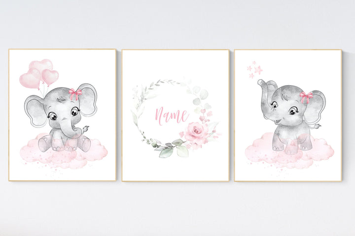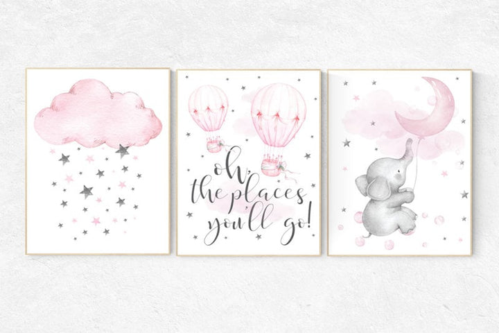 Nursery decor girl elephant, nursery wall art , hot air balloon, pink grey, cloud and stars nursery, oh the places you'll go, pink and gray