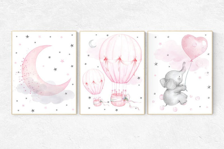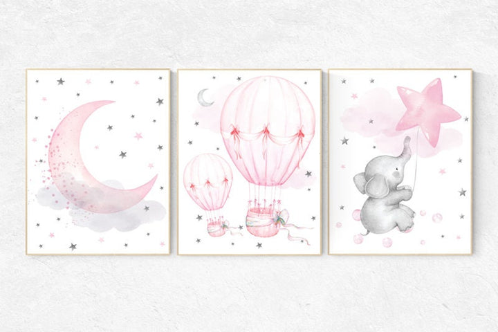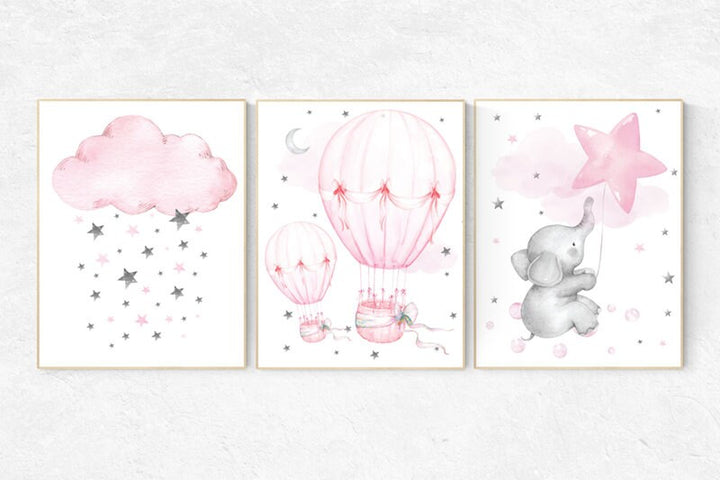 Nursery decor girl elephant, nursery wall art girl , hot air balloon, pink grey, cloud and stars nursery, pink and gray, nursery prints girl