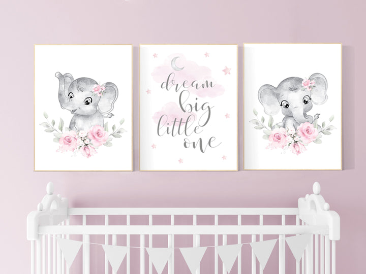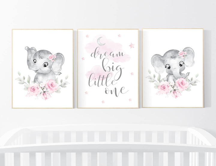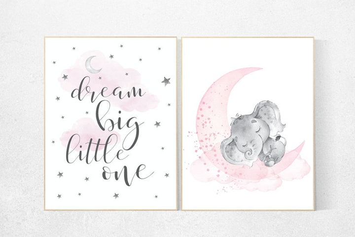 Nursery decor girl elephant, nursery wall art quotes, girl room wall art, pink and gray, moon and stars nursery, dream big little one