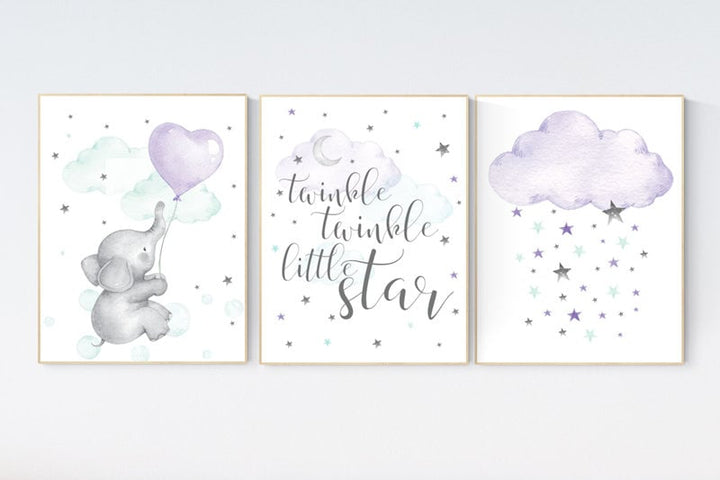 Nursery decor girl elephant, Nursery decor girl purple, twinkle twinkle little star, moon and stars, purple mint, girl nursery wall art