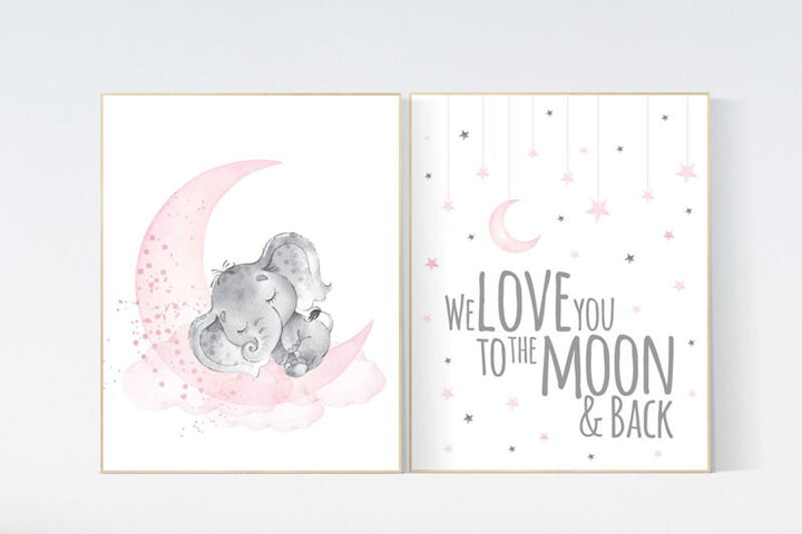 Nursery decor girl elephant, nursery wall art girl pink, we love you to the moon and back, moon print, baby room wall art, moon and stars