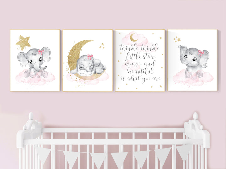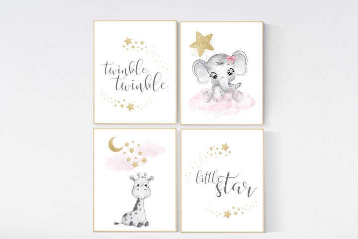 Nursery decor girl elephant, pink and gold nursery, twinkle twinkle little star, pink nursery art, cloud and stars, baby room decor