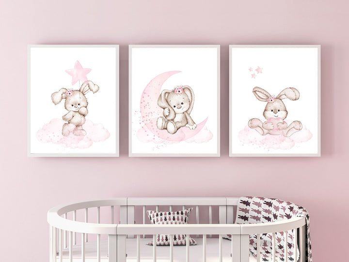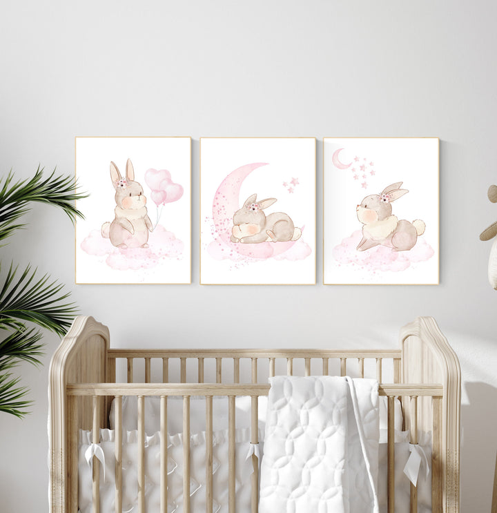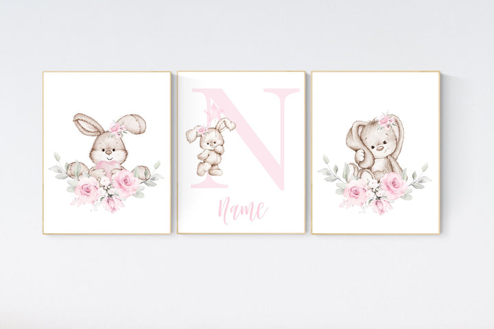 Nursery decor girl flower bunny, Nursery wall art girl, Rabbit nursery print, nursery print set girl, pink, watercolor bunny nursery print,
