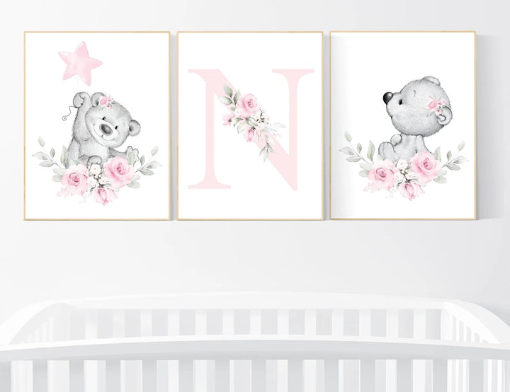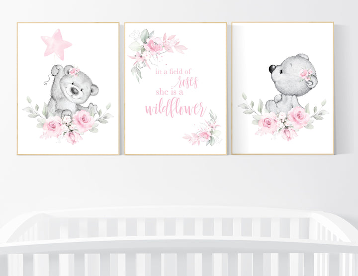 Nursery decor girl flower, bear nursery, floral nursery wall art,, Nursery wall art girl, girl nursery ideas, pink, nursery wall decor