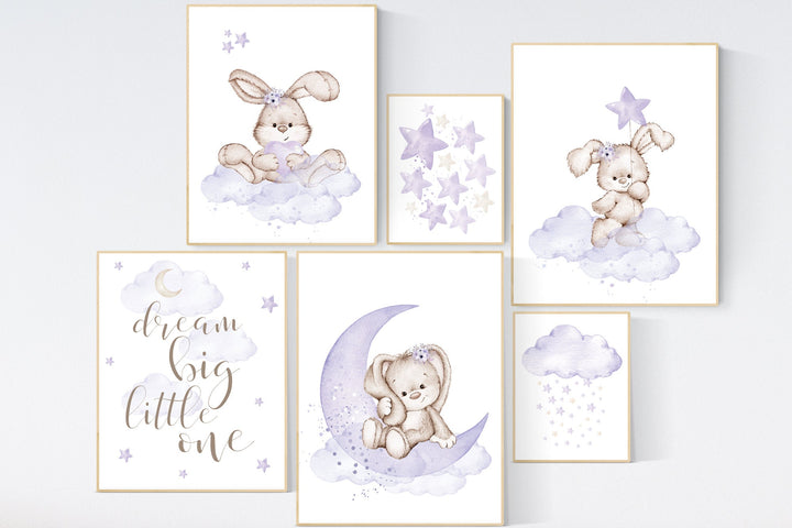 Nursery decor girl flower bunny, Nursery wall art girl, Rabbit nursery print, nursery print set girl, purple, lilac nursery, bunny
