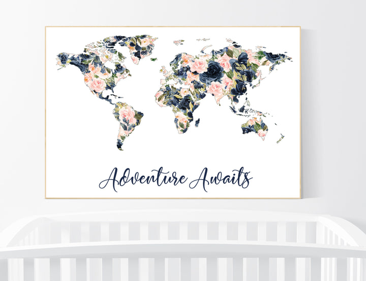 Nursery decor girl floral, map nursery art, world map, girl room decor, girl nursery decor flowers, blush and navy floral, blush navy