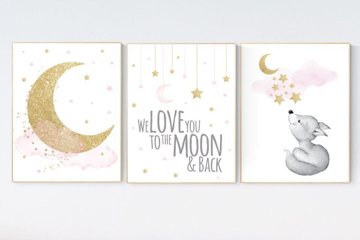 Nursery decor girl fox, nursery decor woodland, pink and gold, nursery prints animals, fox nursery decor, we love you to the moon and back