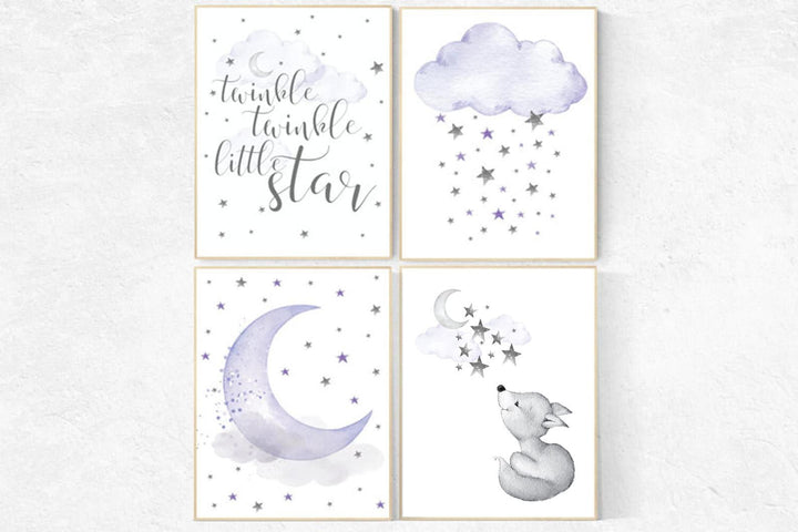 Nursery decor girl fox, purple nursery, lavender, lilac, twinkle twinkle little star, cloud and stars nursery wall art, baby room decor