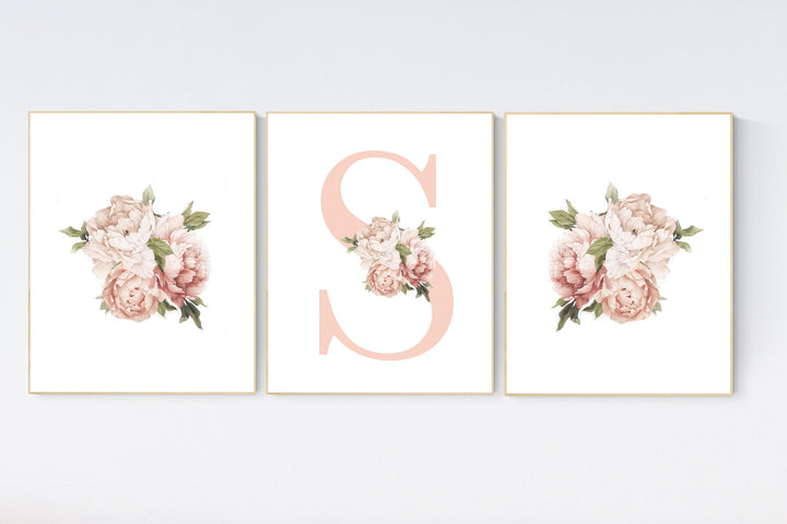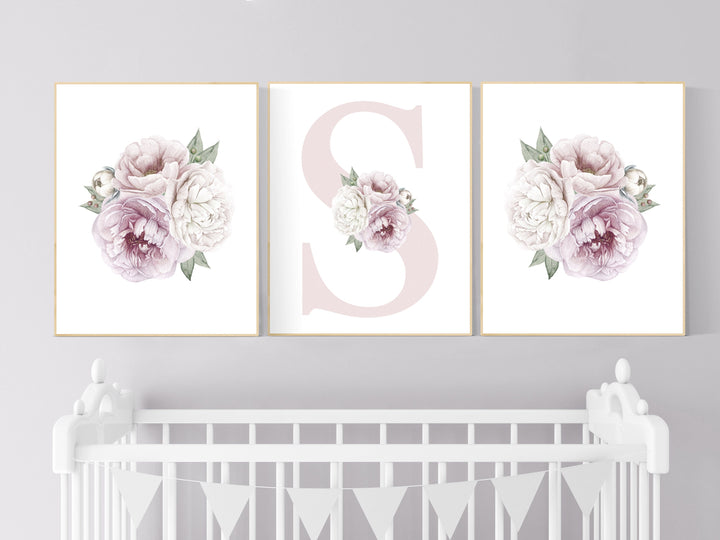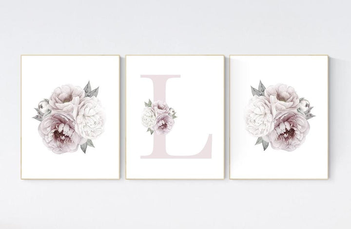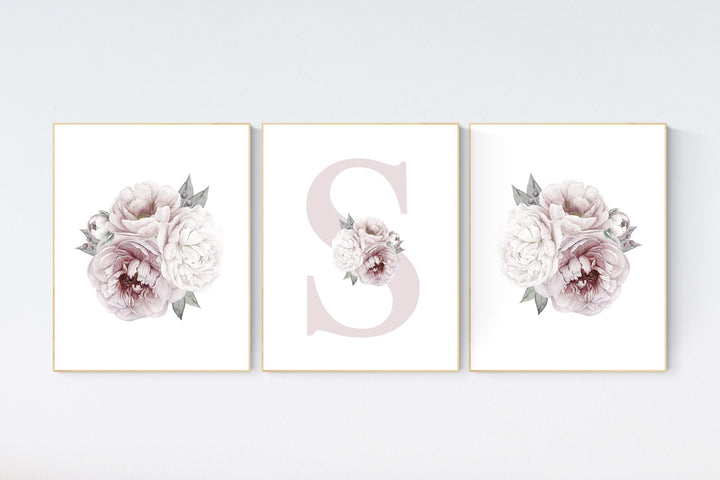 Nursery decor girl flower, floral nursery, peony nursery, Dusty Rose, peony flower, girl nursery wall decor, set of 3 prints, name print