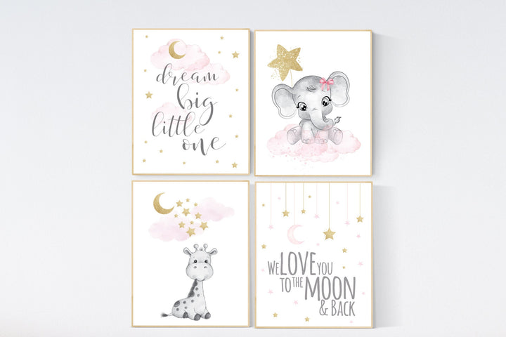 Nursery decor girl giraffe, elephant, pink and gold nursery, twinkle twinkle little star, pink nursery art, cloud and stars, baby room decor