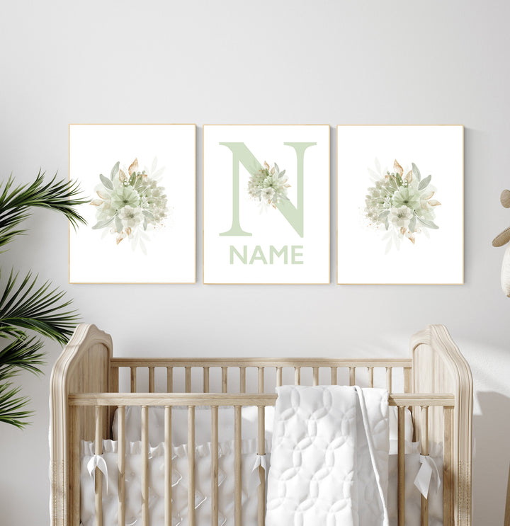 Nursery decor girl flowers, green flowers, herbal, green, mint green, sage green and gold, Nursery decor girl name, girl nursery wall decor