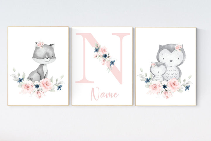 Nursery decor girl fox and owl, nursery decor girl flower, nursery decor girl floral, Boho baby room, pink nursery decor, flower baby room