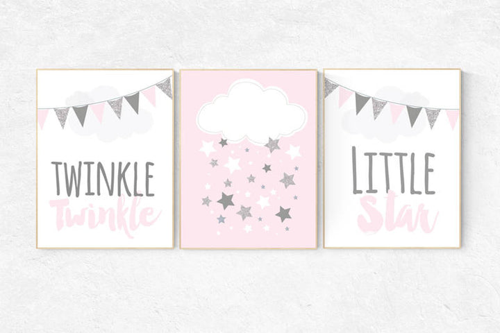 Nursery decor girl pink and gray, twinkle twinkle little star, , girls room decor, cloud and star nursery, pink and silver, pink nursery