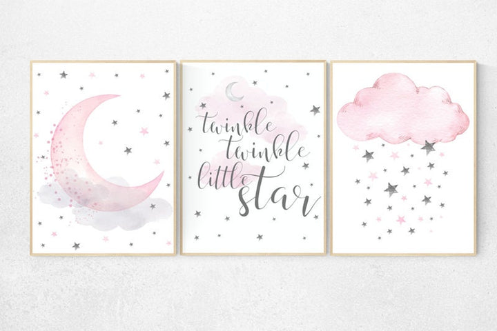 Nursery decor girl pink and gray, nursery decor girl pink, pink nursery, twinkle twinkle little star, cloud nursery, cloud and stars. moon