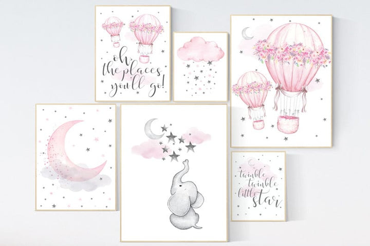 Nursery decor girl pink, Nursery decor elephant, hot air balloon nursery, oh the places you'll go, twinkle twinkle little star, pink gray