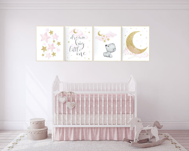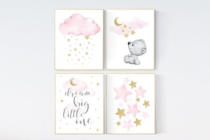 Nursery decor girl pink gold, bear nursery, pink and gold nursery art, cloud and stars, dream big little one, teddy bear, set of 4 prints