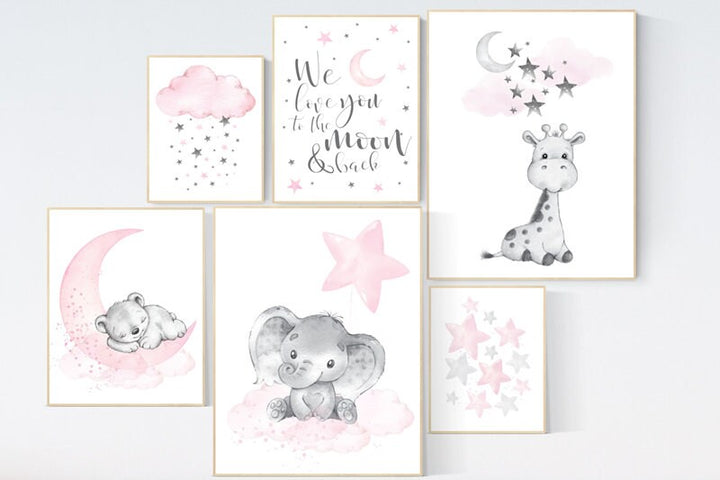 Nursery decor girl pink and gray, pink grey nursery, moon and star, girl nursery wall art, nursery prints gir, elephant nursery wall decor