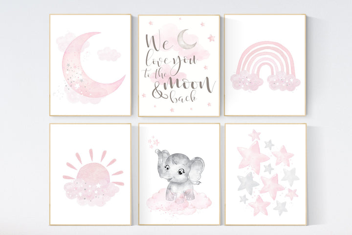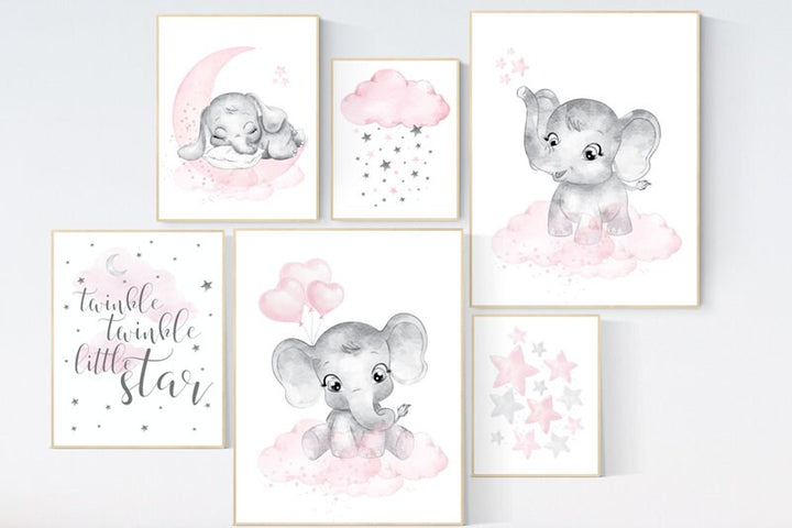Nursery decor girl pink, elephant, pink grey, nursery decor girl pink, moon and stars, nursery prints girl, nursery girl decor ideas