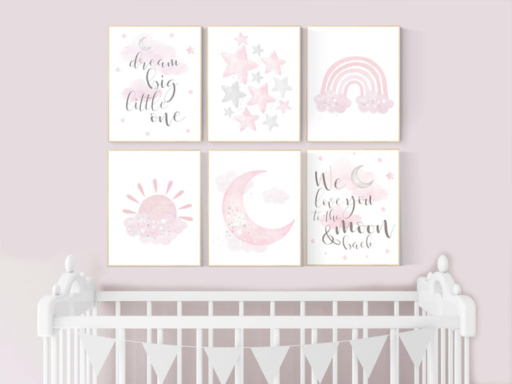 Nursery decor girl pink and gray, pink grey nursery, moon and star, girl nursery wall art, nursery prints girl, rainbow nursery wall decor