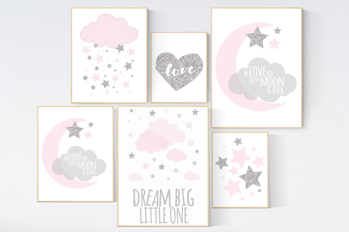 Nursery decor girl pink and silver, stars nursery decor, dream big little one, pink silver nursery print, moon and back, cloud and stars