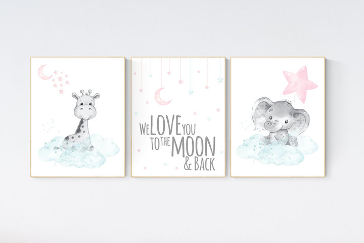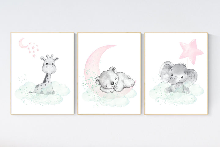 Nursery decor girl pink mint, elephant nursery wall art, pink and mint, moon, stars, nursery prints