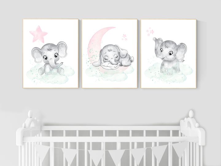 Nursery decor girl pink mint, elephant nursery wall art, pink and mint, moon, stars, nursery prints, baby room decor, girl nursery wall art
