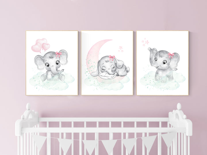 Nursery decor girl pink mint, Nursery wall art girl elephant, pink and mint, moon, stars, nursery prints, baby room decor, girl nursery