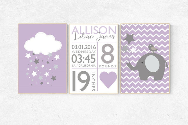 Nursery decor girl purple, baby birth stats, Purple nursery decor, baby girl nursery wall art, nursery decor elephant, lilac, lavender