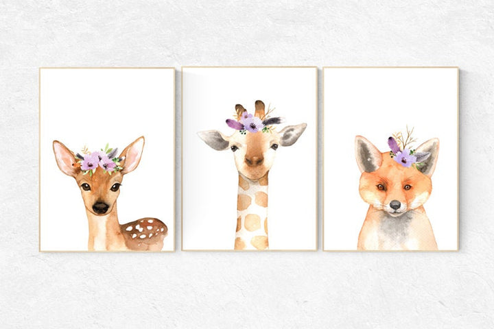 Nursery decor girl purple, animal flower crown, nursery prints animals, nursery decor girl flower purple flower nursery, woodland animals