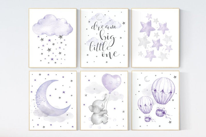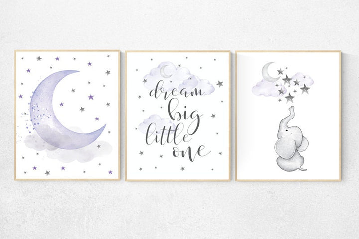 Nursery decor girl purple, Nursery decor girl elephant, lilac nursery wall art, dream big little one, purple nursery prints, lavender