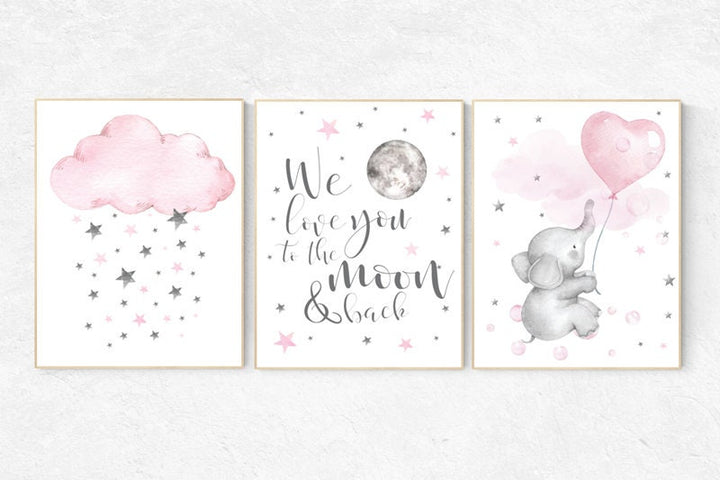 Nursery decor girl pink, nursery wall art girl, Nursery decor girl pink and gray, Baby room decor elephant, we love you to the moon and back