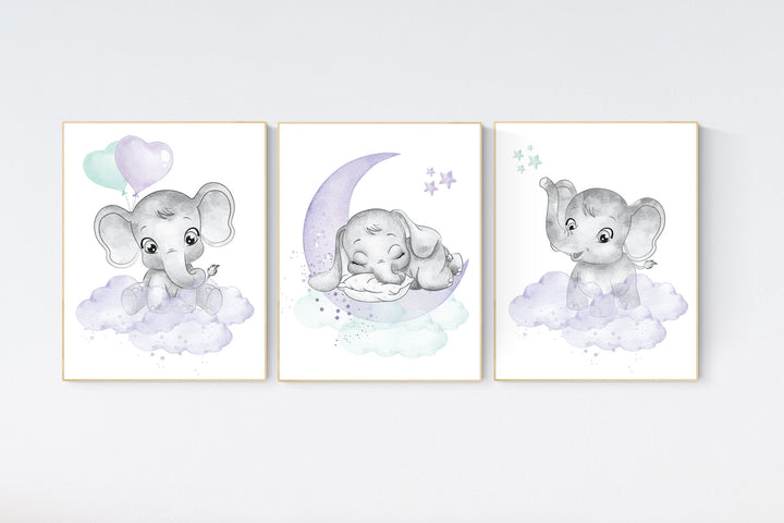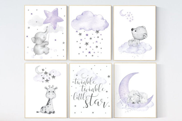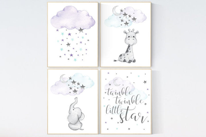 Nursery decor girl purple teal, twinkle twinkle little one, elephant nursery, lilac and mint nursery prints, cloud nursery, lavender, purple