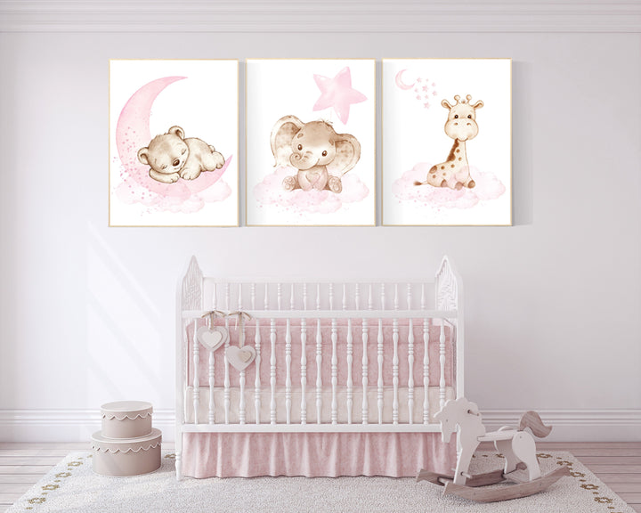nursery decor girl pink, nursery decor girl woodland animals, nursery decor animals, teddy bear, elephant, giraffe, baby girl nursery prints