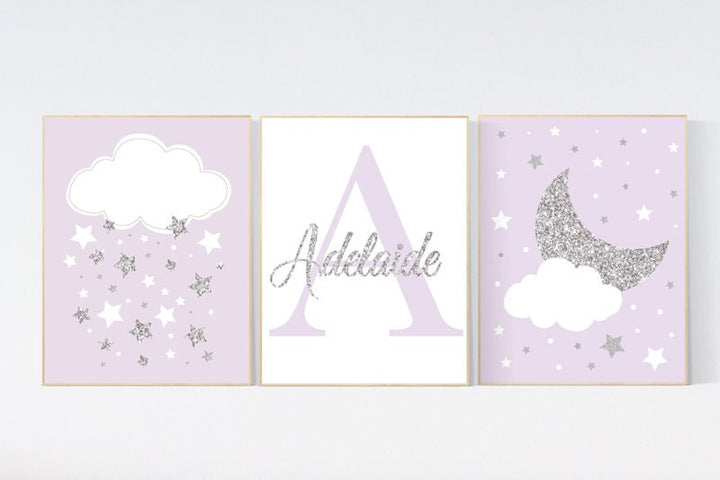 Nursery decor girl purple silver, nursery decor girl lavender and gray, lilac silver nursery, purple nursery, cloud, moon and stars