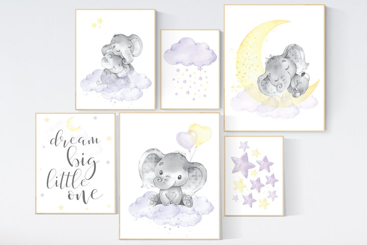 Nursery decor girl purple yellow, lilac yellow, nursery wall decor, moon and stars, lavender and yellow, gender neutral, elephant nursery