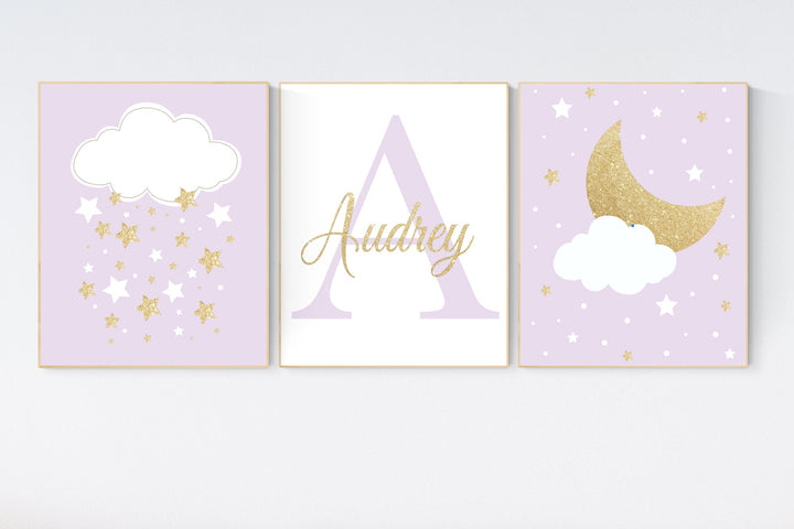 Nursery decor girl purple gold, nursery decor girl lavender and gray, lilac gold nursery, purple nursery, cloud, moon and stars