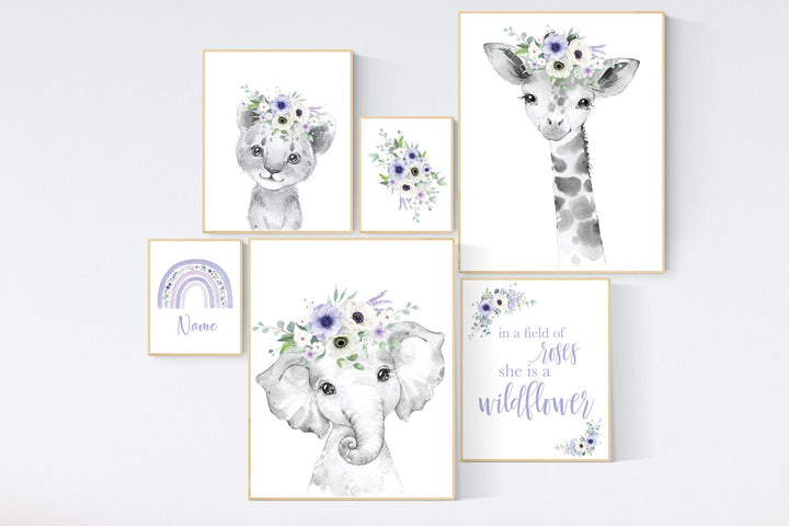 Nursery decor girl purple, animal nursery, Safari animals, Floral Nursery Prints, purple nursery, girls nursery decor, elephant nursery
