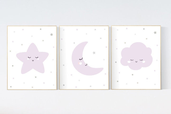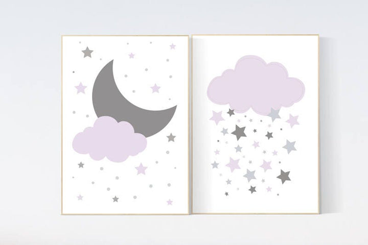 Nursery decor girl purple, cloud, moon and stars, nursery wall art lilac and grey, moon star, cloud, nursery wall art girl, girl nursery