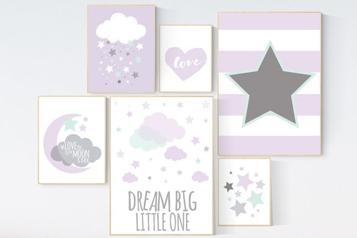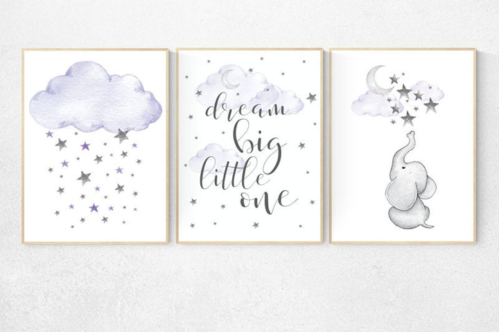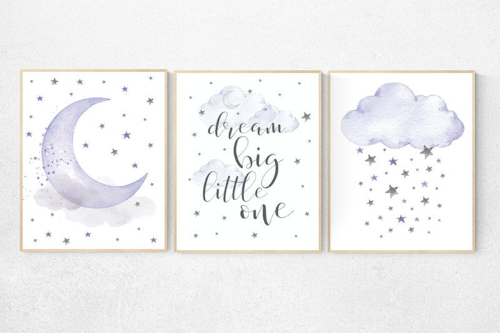 Nursery decor girl purple, lavender and grey, nursery wall decor, lilac nursery, dream big little one, cloud, stars, moon, set of 3 prints