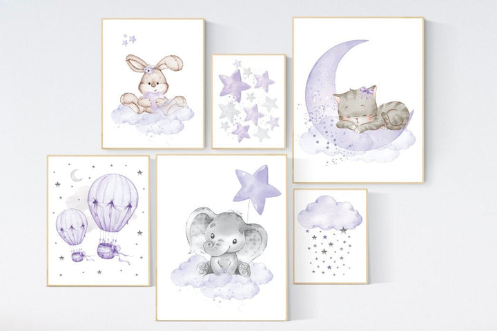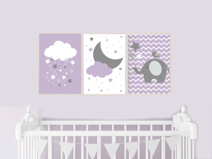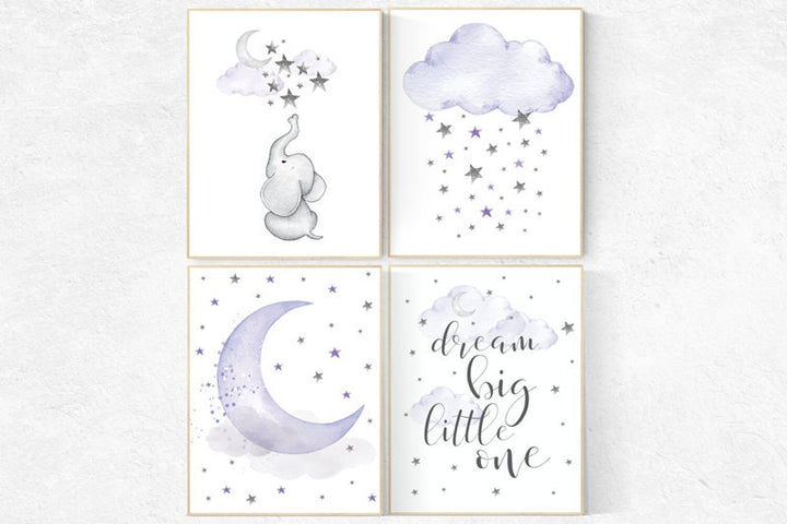 Nursery decor girl purple, cloud, moon and stars, purple nursery wall art, elephant nursery, girl nursery ideas, purple prints for nursery