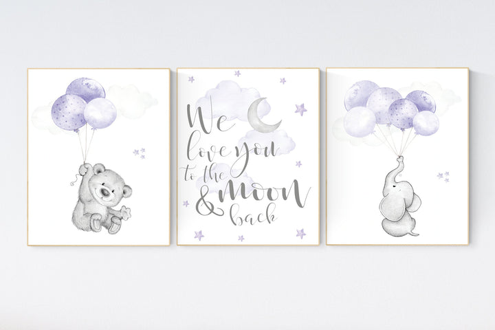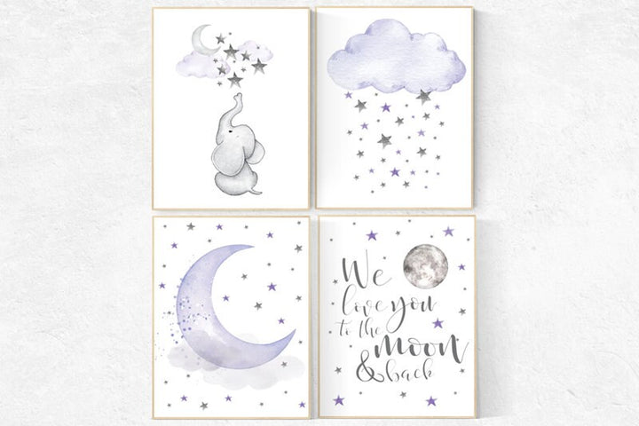 Nursery decor girl purple, elephant nursery, lavender gray, lilac, we love you to the moon and back