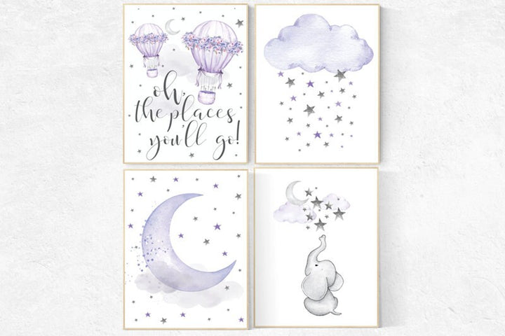 Nursery decor girl purple, cloud and stars, oh the places you'll go, lavender nursery art, lilac nursery decor, hot air balloon nursery