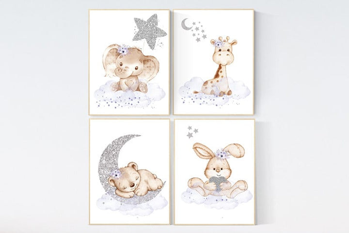 Nursery decor girl purple, giraffe, elephant, bunny, bear, purple silver, baby room art, animal nursery wall art, girl nursery, baby room