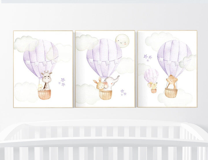 Nursery decor girl purple, hot air balloon, nursery decor girl purple, animal nursery, lilac nursery, elephant, giraffe, bear, bunny